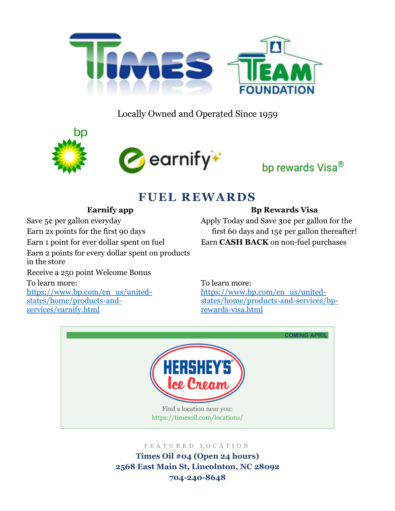 Look for our latest ad in the Lincoln Times-News — featuring exciting details on our BP Fuel Rewards programs, including the Earnify app and BP Rewards Visa, plus our newest offering now available at all locations. Stop in, fuel up, and start saving today!